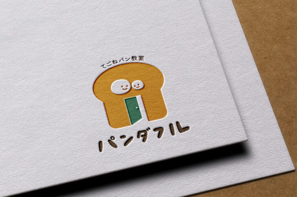 おうちパン教室であるということが一目でわかるよう、パン型の家をロゴモチーフといたしました。パン型のおうちの中にパンの親子のデザインを組み合わせたかわいらしいデザインです。パンの親子の顔の向きで、寄り添う、暖かなイメージを表現しています。誰でも気軽に来てほしいという思いが伝わるよう、扉は開けています。
