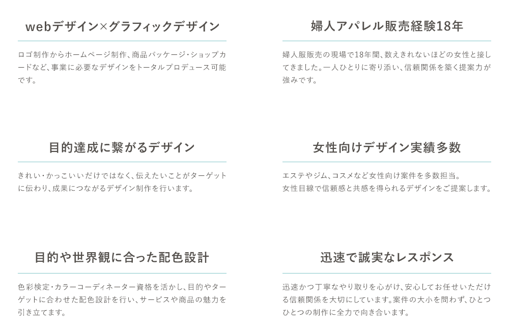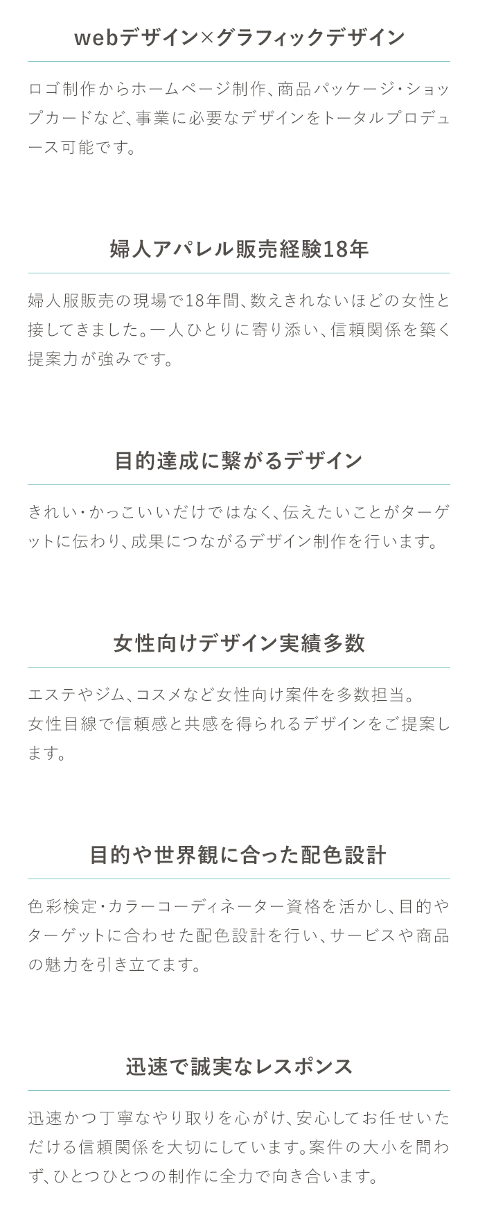 現在はその経験を活かし、 女性ターゲットのサービスやブランドに特化したWebデザイン・LP制作・グラフィックデザインを行っています。