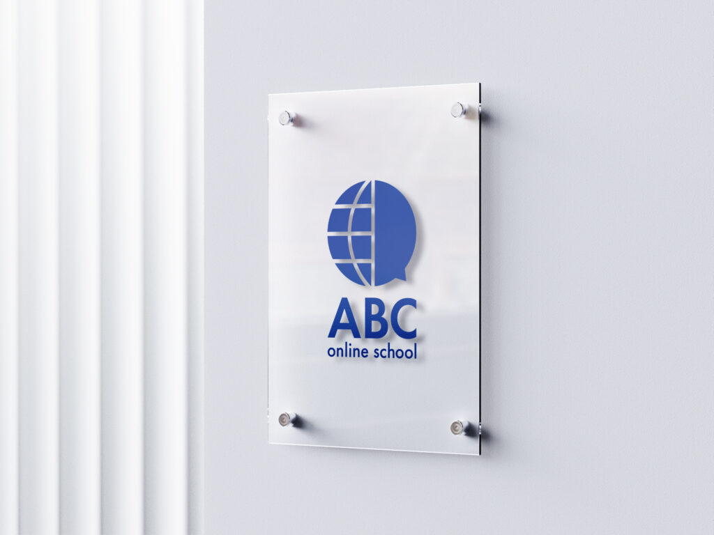 オンライン英会話スクールロゴ 前提条件 デザインの説明 ロゴマークは地球と吹き出しのデザインをシンプルな形で表現しました。「ABC」の文字を大きく配置し、力強さを表現しました。フォントは読み易さを重視し、シンプルなゴシッ
