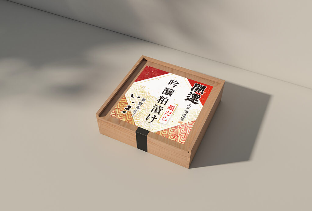 吟醸粕漬けの魚の切り身真空パックラベルデザイン 前提条件 デザインの説明 類似商品が並ぶ食品の棚であっても、しっかりと目にとめてもらえるよう華やかなカラーをメインに、プレゼントやお土産としてもご購入いただくことを考え、懸