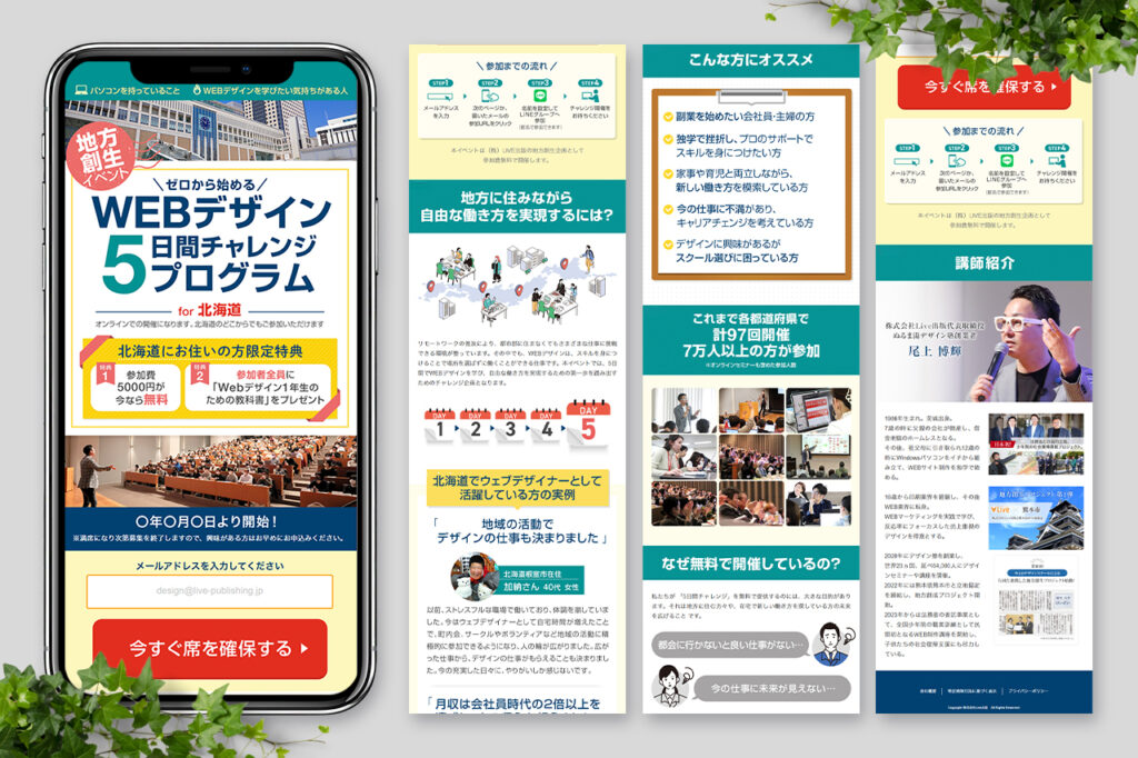 デザインはWebデザインの明るく楽しそうなイメージが伝わるよう、カラフルな配色にしております。カラフルな中でも、CTAがしっかりと目立つよう配色やボタンの大きさにこだわっています。