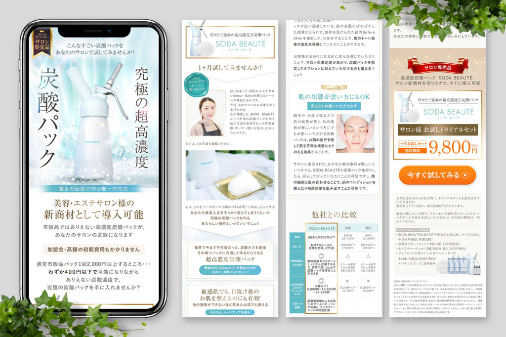 サロン向け炭酸パックLP / ウェブデザイン, ランディングページ, 制作実績 / By norikohashimoto エステサロン向け炭酸ジェルパックLP 使用ツール:Photoshop 、VSCode、HTML、CSS 担当:デザイン、コーディング 2025年5月